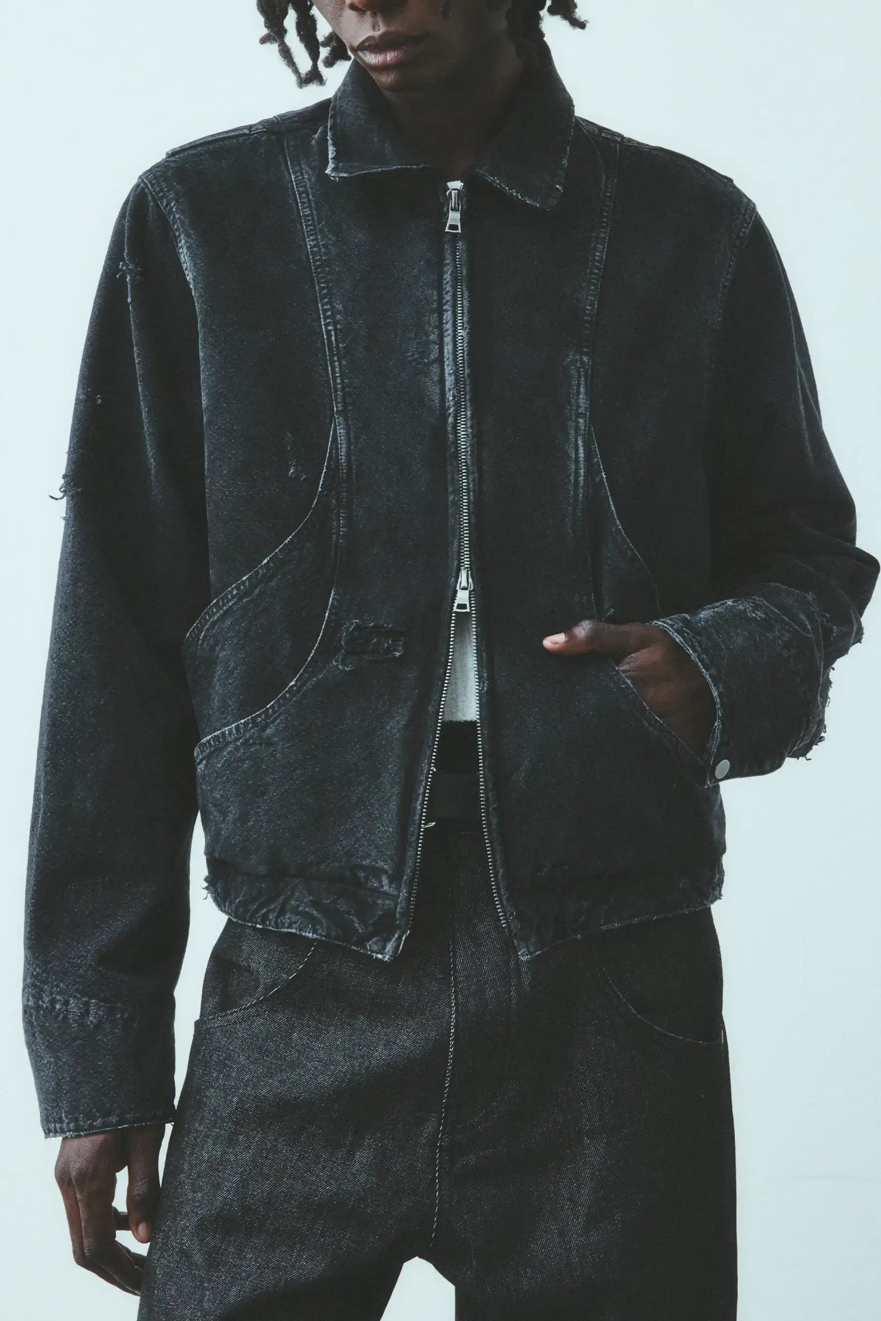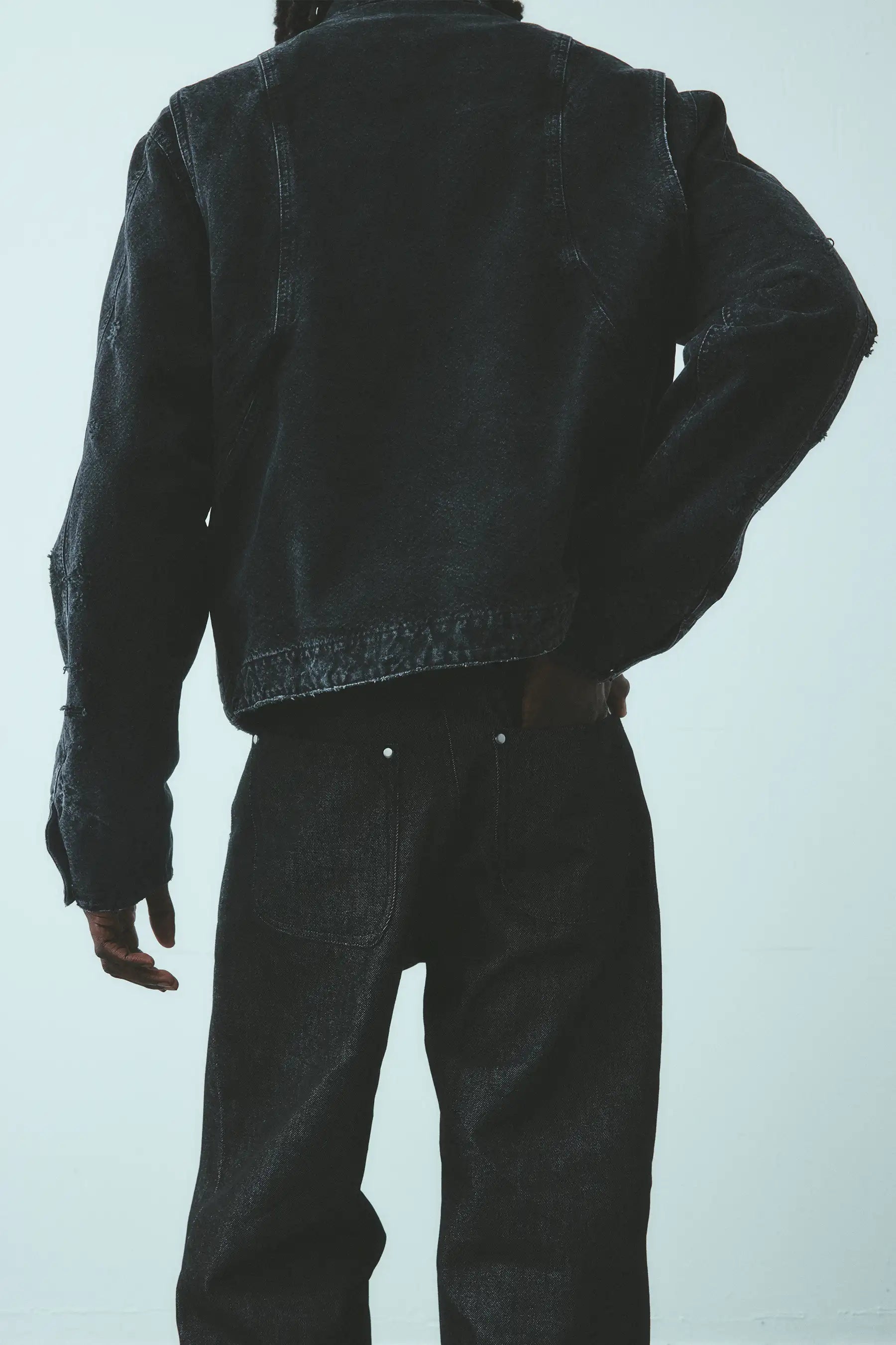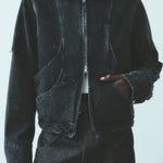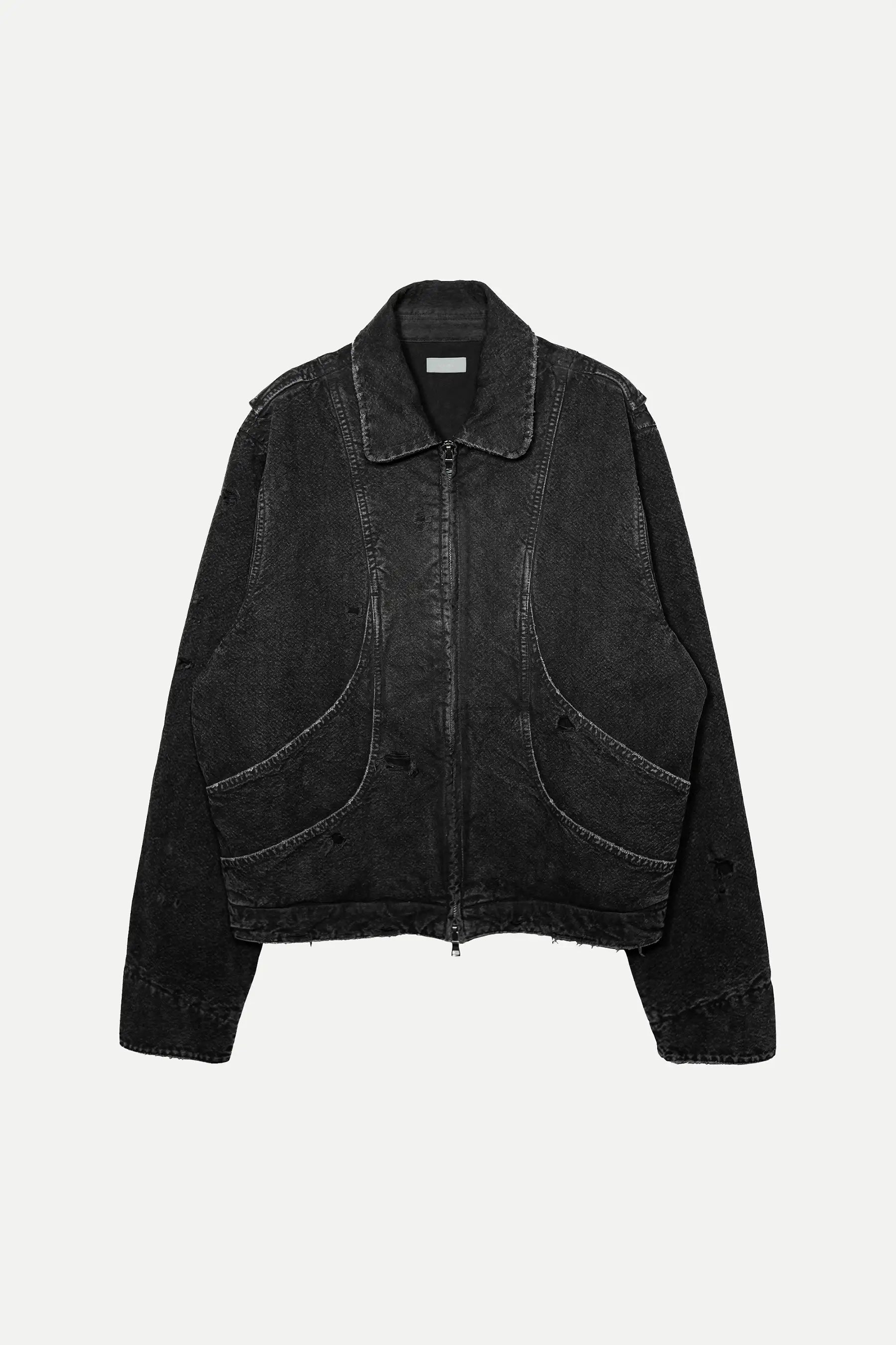 Cut and sewn in Los Angeles from firm USA milled canvas, this jacket is the result of seven rounds of testing to resolve balance, structure, and proportion. The canvas is stone washed to open the weave, then hand distressed by eye, so the marks, fading, and surface character fall differently on every jacket. Hardware and the blue leather patch are finished individually, preserving small variations that keep each piece distinct.